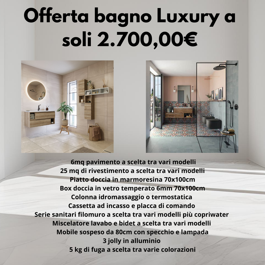 Progetta il bagno dei tuoi sogni con questa imperdibile offerta che include: ✅ 6 mq di pavimento a scelta tra vari modelli. ✅ 25 mq di rivestimento a scelta tra vari modelli. ✅ Piatto doccia in marmoresina 70x100 cm. ✅ Box doccia in vetro temperato 6 mm (70x100 cm). ✅ Colonna idromassaggio o termostatica. ✅ Cassetta ad incasso...